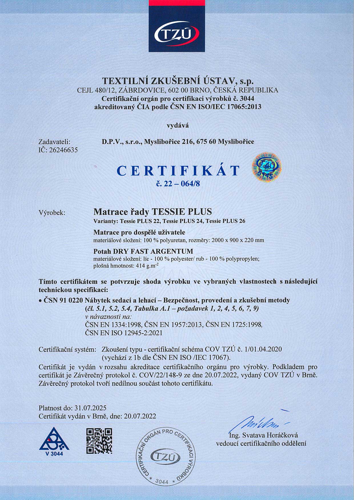 Kombinace kvalitních studených pěn a visco pěny zaručuje vysoký komfort spánku na matraci Tessie Plus. Vrchní roznášecí visco vrstva nabízí unikátní pocit při ležení z důvodu reakce této jedinečné pěny na teplotu lidského těla a dokonale se přizpůsobuje. Povrch jádra ze strany Visco pěny není rozdělen na zóny a matrace je tak vhodná pro spánek na břiše a pro lidi často měnící spánkovou polohu. Druhá strana matrace Tessie Plus nabízí originální sedmi zónový prořez v oblasti ramen a pánve, který garantuje ideální ortopedické vlastnosti při spánku na boku a zádech. Matrace je vhodná na lamelový rošt pevný i polohovací. Vysoká životnost matrace Tessie Plus je zajištěná použitím kvalitních pěn. Matrace Tessie Plus je vysoká 22 nebo 24 nebo 26 cm a je určena pro váhovou kategorii do 130kg.